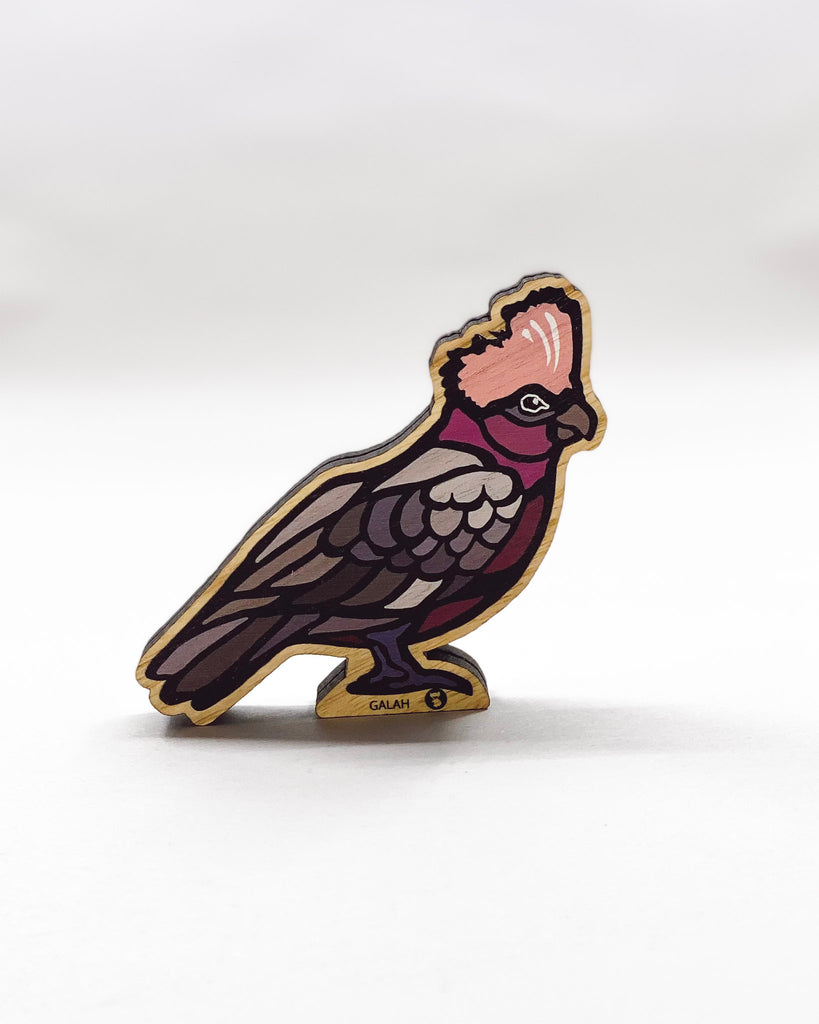 Standing wooden figurine of popular native Australian birds. The Galah is depicted in bright colours on one side and easily handled. These figures are ideal for small world play.